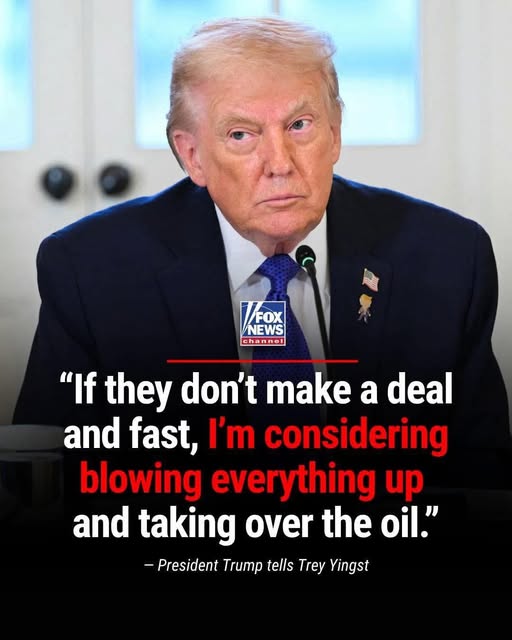 “If they don’t make a deal and fast, I’m considering blowing everything up and taking over the oil,” said President Trump, referring to the Iranian regime.